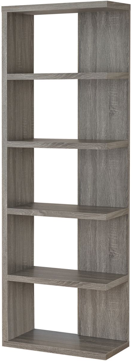 Modern bookcase in weathered grey finish features interesting design with shelves open on one end
