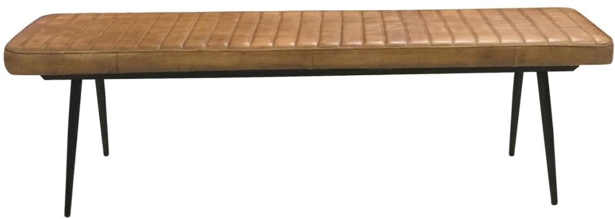 Pull up this long upholstered bench seating to a dining table or place at the foot of a bed. Perfect for an industrial style loft apartment or modern farmhouse home, this bench offers padded cushion for complete comfort and support. The foam-filled bench cushion even lends a vintage, boho-chic charm with a hand dyed goat leather fabric in a warm camel of dark espresso hues and a channel tufted design. Each end of the bench is supported by tapered and flared metal legs in a deep black finish. This bench is part of the Misty collection, which also offers matching chairs, as well as a coordinating dining table and server.